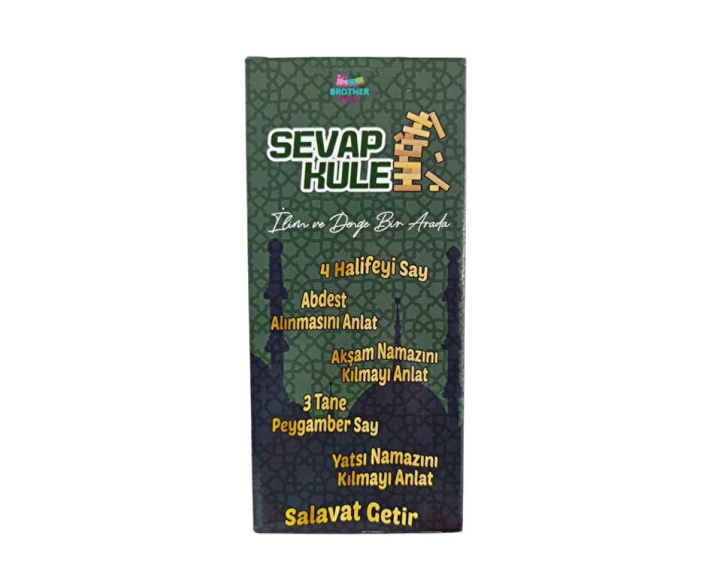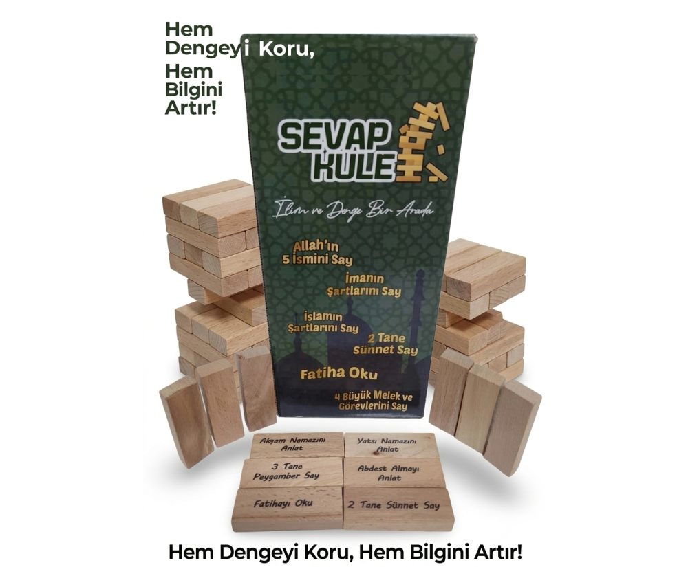 Denge Oyunu Sevap Kule, dikkat ve denge gerektiren eğlenceli bir masa oyunudur. Oyuncular parçaları dikkatli bir şekilde üst üste yerleştirerek kuleyi devirmeden en yüksek yapıyı oluşturmaya çalışır. Oyun sırasında çıkan dini sorular sayesinde oyuncular hem eğlenir hem de dini bilgiler hakkında yeni şeyler öğrenir. Bu oyun çocukların el-göz koordinasyonunu, dikkatini ve bilgi düzeyini geliştirmeye yardımcı olur. Aile bireyleri ve arkadaşlar arasında keyifli ve öğretici bir oyun deneyimi sunar.